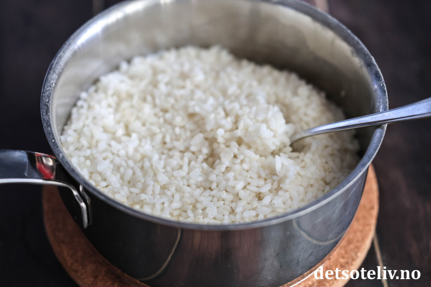 Legg på lokk og senk varmen. La risen småkoke i ca. 10 minutter. Ta kjelen av platen og la risen bli i kjelen med lokket på til den er romtemperert.