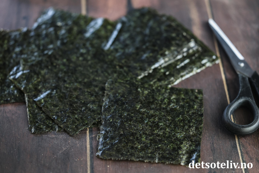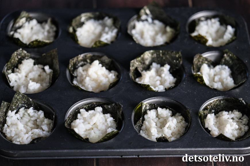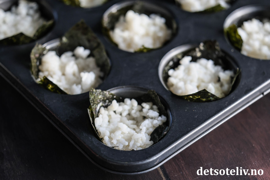 Finn frem et muffinsbrett. Klipp opp hvert noriark i 4 deler slik at du får 12 like store firkanter. Legg ca. 2 ss sushiris i midten av hvert noriark og legg dem i muffinsformene. Press dem forsiktig ned og pass på at risen legger seg i midten og at du har en kant med noriark på alle sidene.