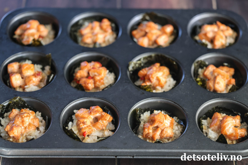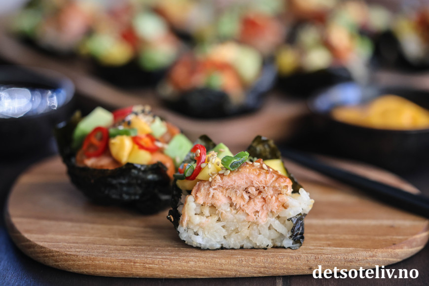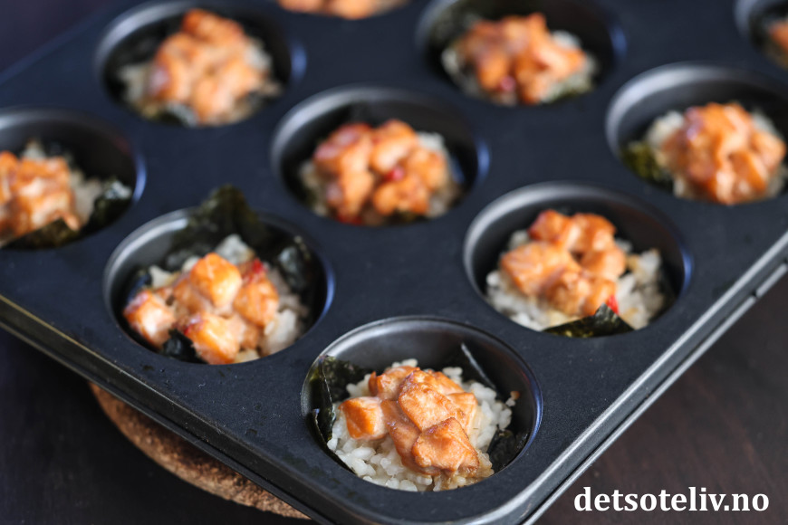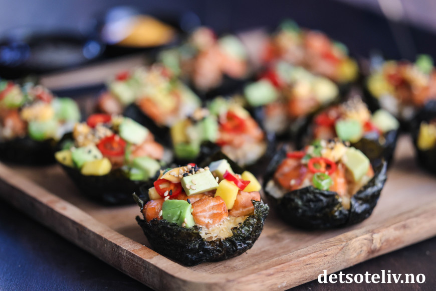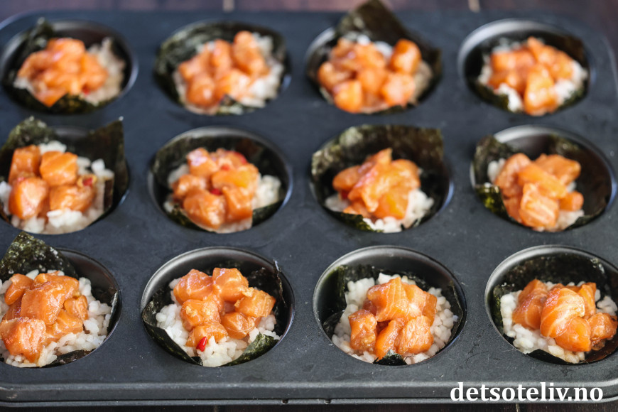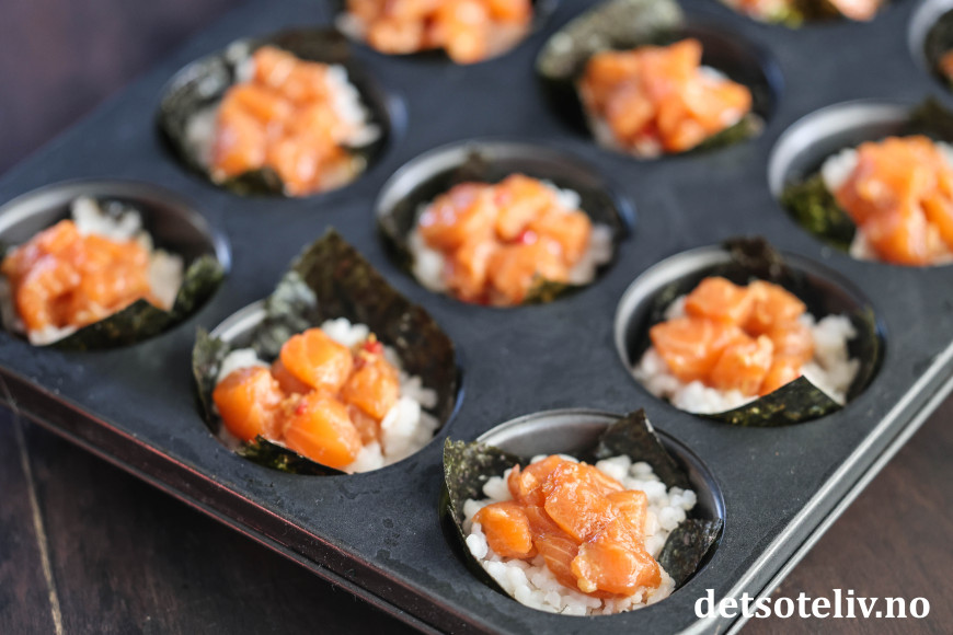Konseptet går ut på å lage lekre munnfuller av noriark, sushiris og marinert laks, som fylles i muffinsformer og bakes i ovnen. Deretter topper du med små terninger avokado, mango, vårløk, chili, chilimajones og sesamfrø.