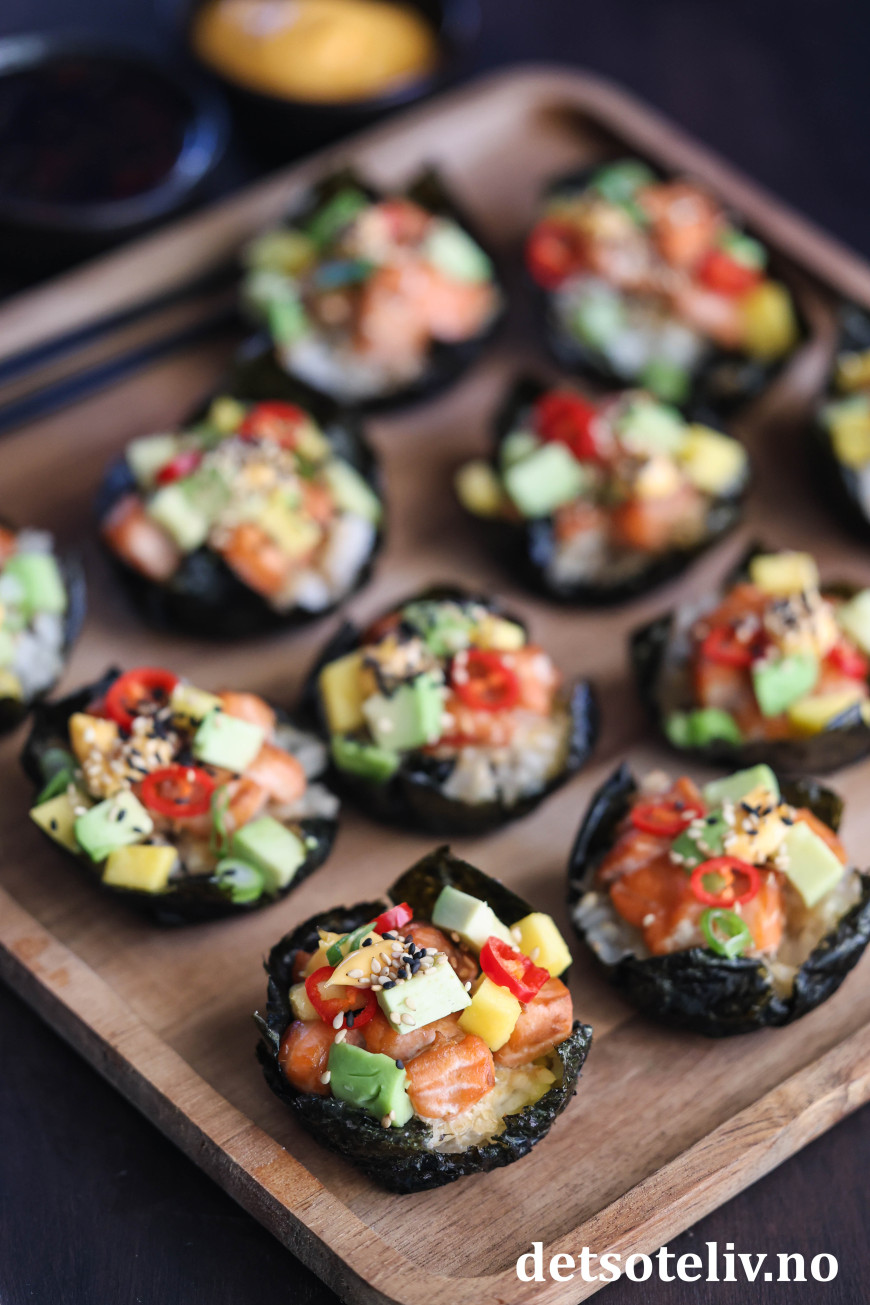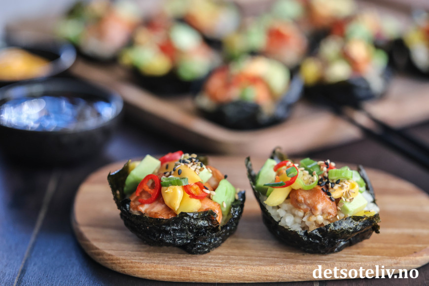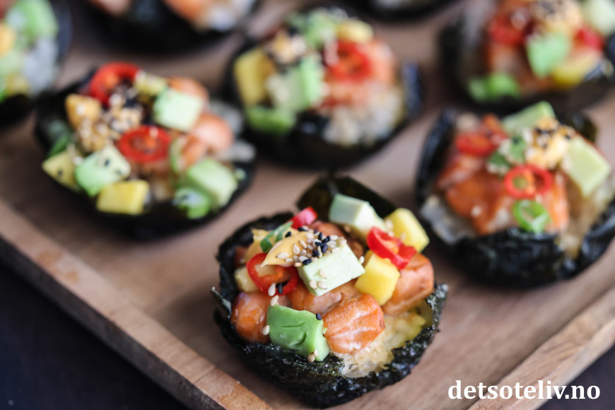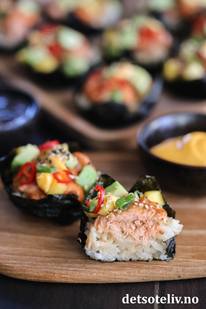 Konseptet går ut på å lage lekre munnfuller av noriark, sushiris og marinert laks, som fylles i muffinsformer og bakes i ovnen. Deretter topper du med små terninger avokado, mango, vårløk, chili, chilimajones og sesamfrø.