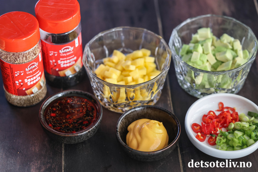 Rens avokado og mango og del i små terninger. Kutt opp vårløken og chili i tynne strimler. Fordel topping på hver sushimuffins. Legg også på en god klatt chilimajones og dryss over sesamfrø.