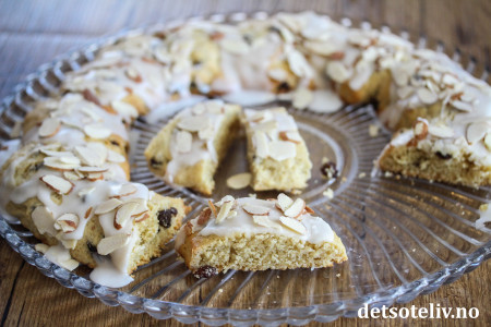 Pisk mykt smør og sukker til smørkrem. Pisk inn egget. Bland i melken og sikt i hvetemel, bakepulver og vaniljesukker. Rør inn rosiner (dette skal bli en nokså klissete deig).