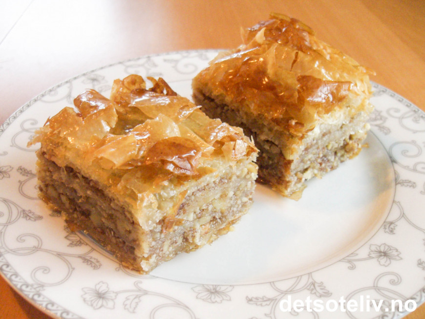 Legg et ark med filodeig i langpannen. Filoarket vil være større enn langpannen. Smør over med smeltet smør, og brett over resten av filoarket. Pensle over med smør. Legg så på neste filoark (begynn da på den andre siden av langpannen), pensle over smeltet smør og brett over resten av filoarket. Gjenta fire ganger, slik at du har brukt opp 6 filoark. Ha over 1 dl av nøtteblandingen.