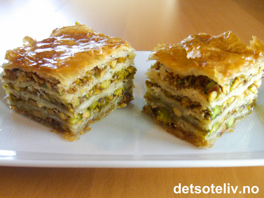 Det er ikke så nøye akkurat hvor mange ark med filodeig du har mellom hvert lag. Det blir uansett ikke nøyaktig, siden det varierer hvor mange ark med deig det er i pakken. Men det kan være lurt å ha litt flere filoark i bunnen og på toppen, for å gi kaken litt mere hold. Det viktigste å huske på når du lager "Baklava" er at det må være smørpensling mellom hvert lag med deig, også når du bretter over den delen av deigplaten som er større enn langpannen. Da forhindrer du at deiglagene klebrer seg sammen, slik at du får mange, tynne lag med deig (litt som i wienerbrød).