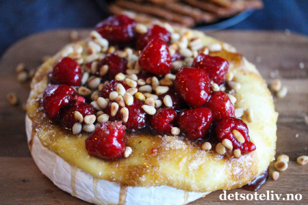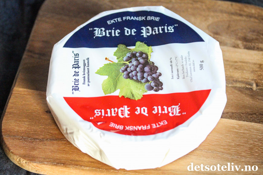 ♥ Som sagt har jeg her brukt osten Brie de Paris, som blant annet fås kjøpt hos Meny, Coop Mega, Rema 1000, Kiwi og Joker. Osten finnes både i stor størrelse på 500 g som jeg har brukt her, og i mindre størrelse på 250 g. Den største osten er best egnet til denne oppskriften, så du får plass til toppingen.