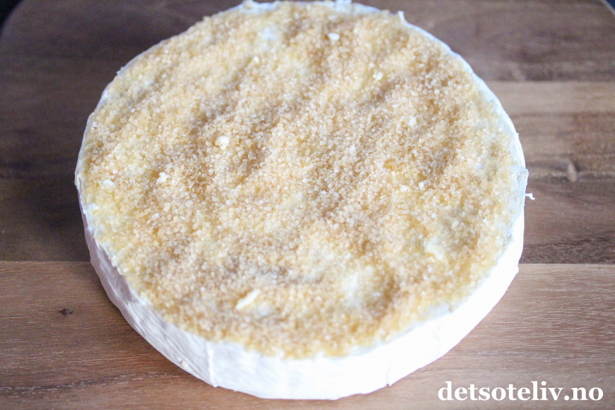 Pakk ut osten og skjær bort det øverste hvite laget med en skarp kniv. Dryss på brunt sukker.