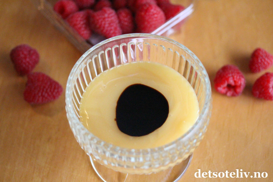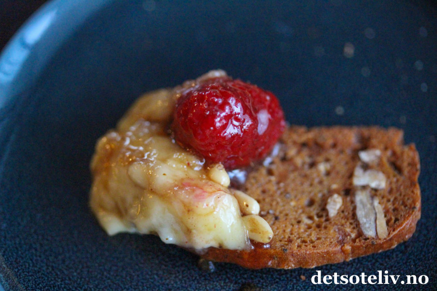 Ha så i bringebærene og vend forsiktig rundt med en skje så bringebærene blir dekket med honning. La bærene ligge i den varme honningen i noen minutter, til osten er klar.