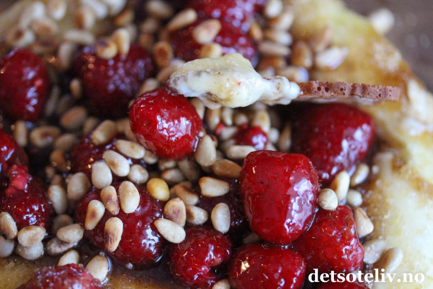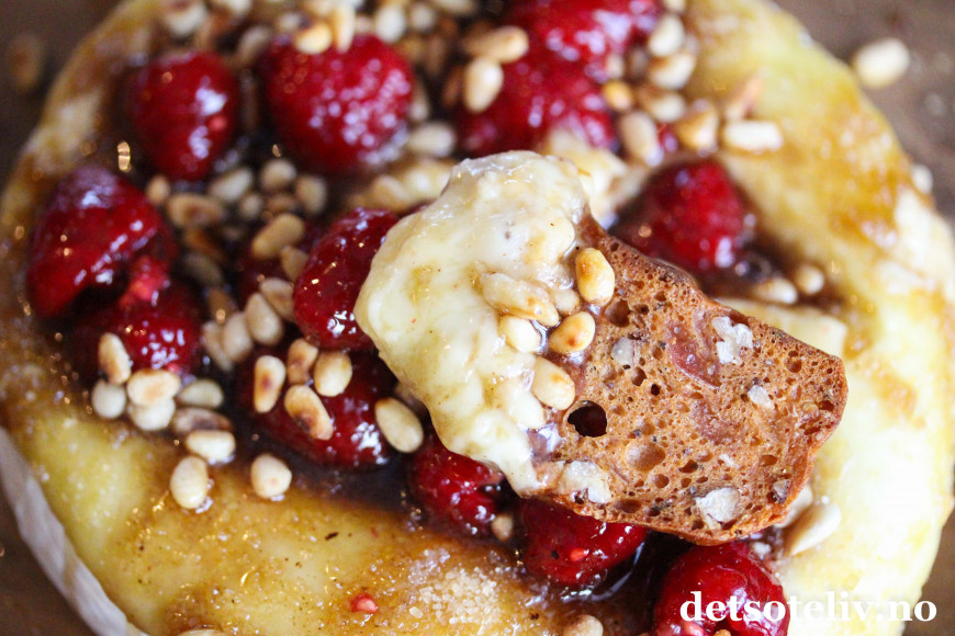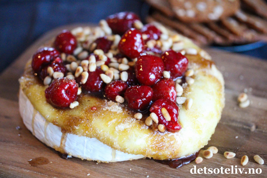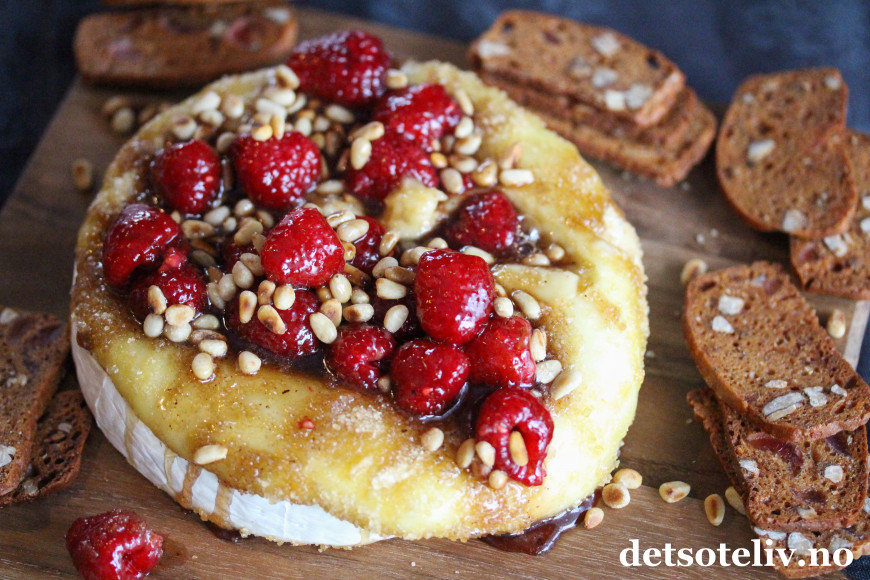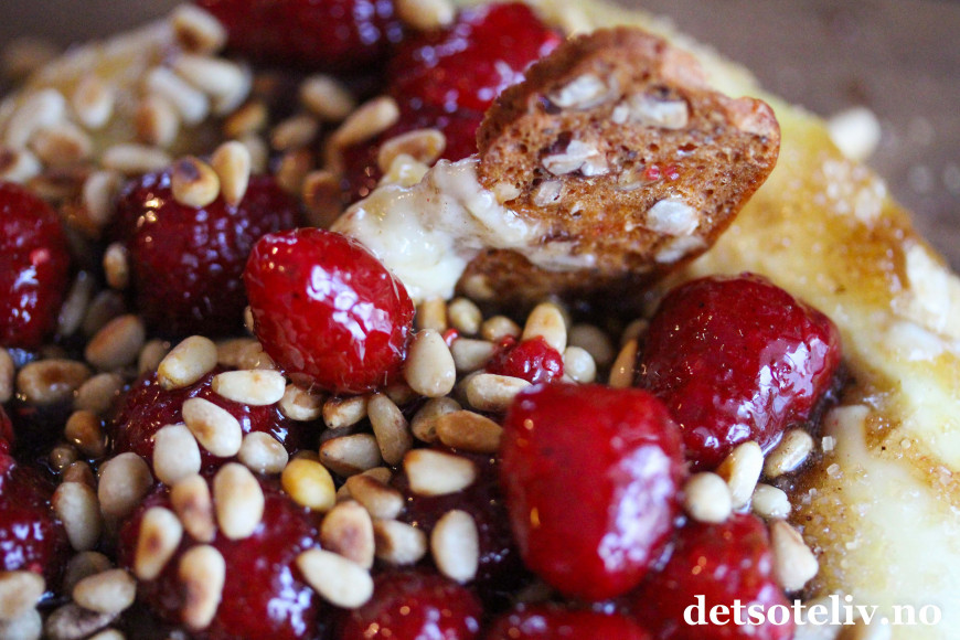 Bakt brie kan toppes med mye godt. Her har jeg brukt bringebær som har ligget og marinert seg i honning, balsamico og ristede pinjekjerner.