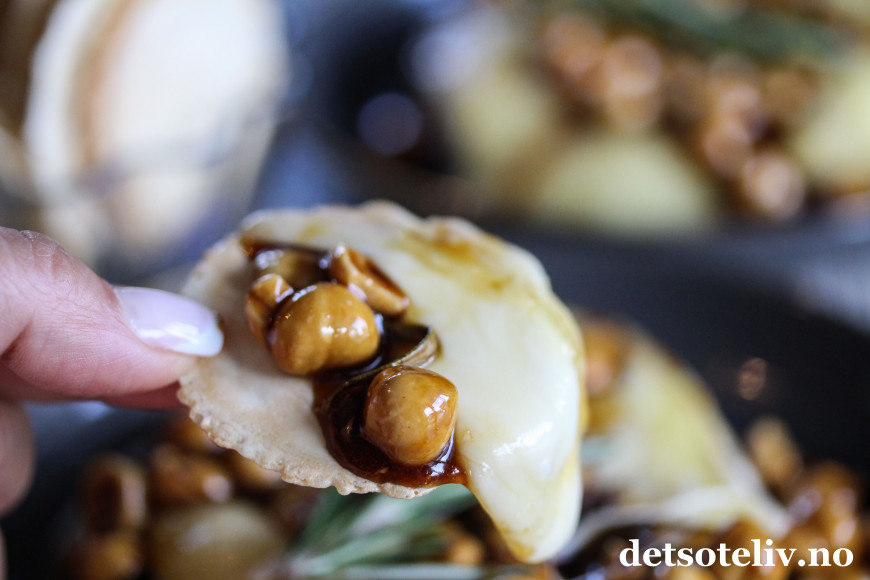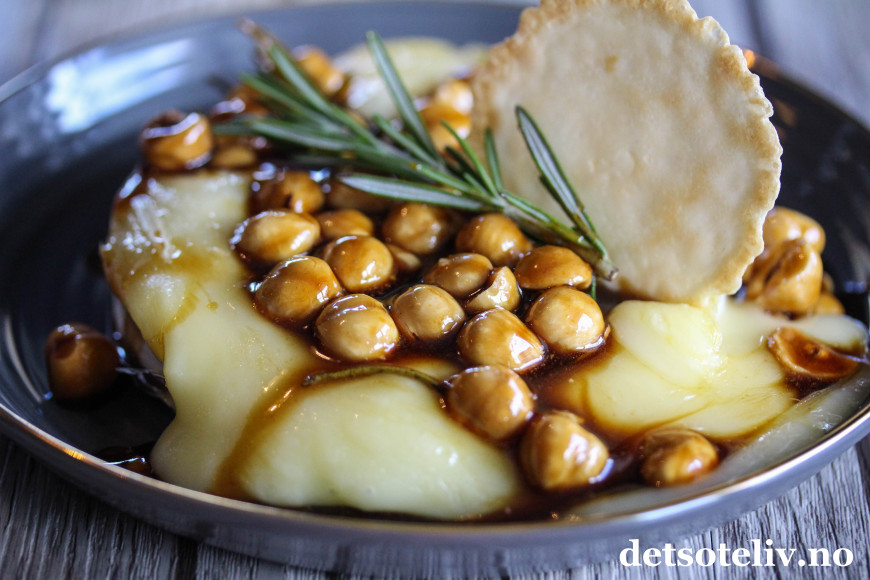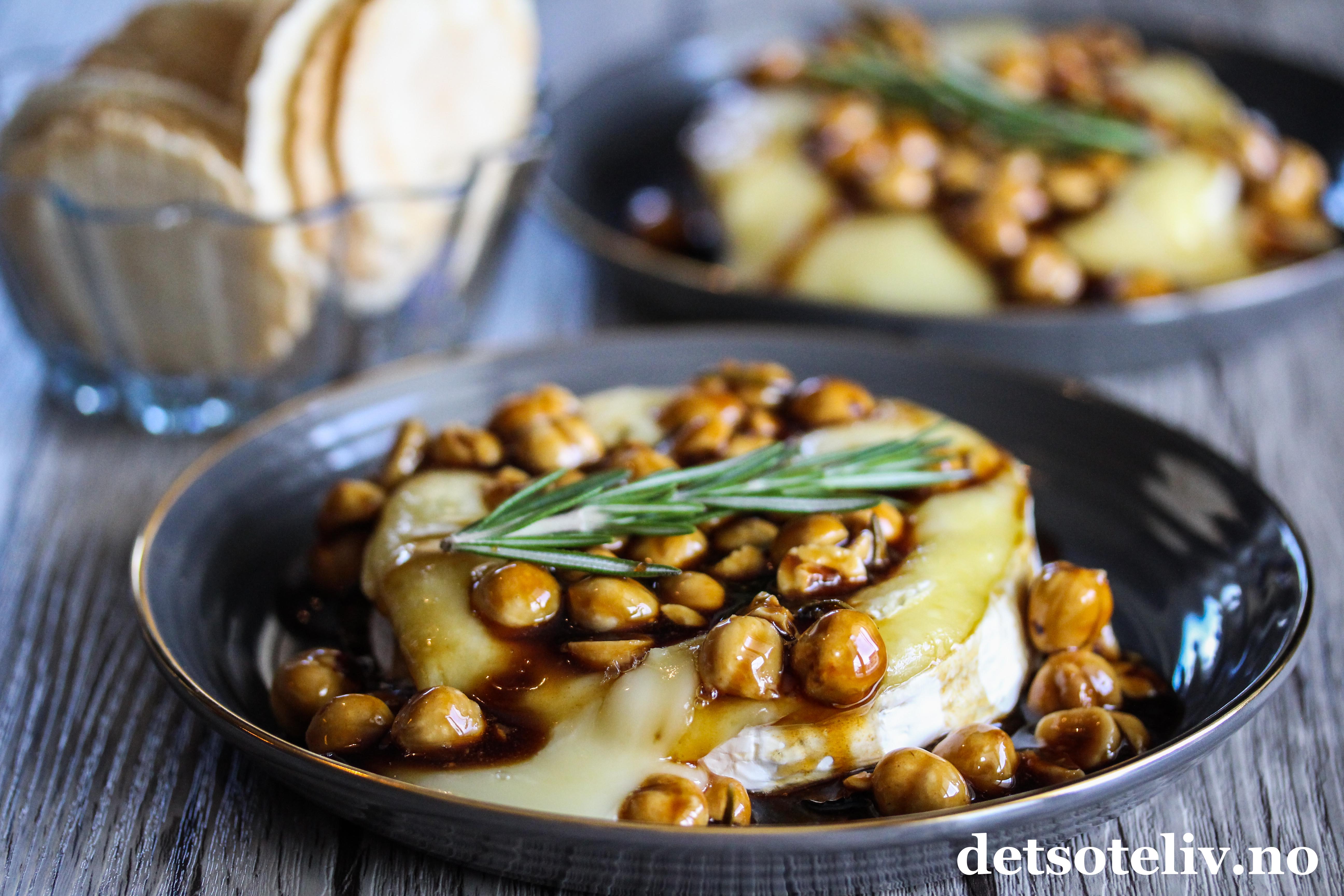 Jeg fant et tips på nettet der bakt brie var kombinert med en fransk "gastrique", som er en berømt, fransk, tykk saus basert på eddik og honning (eller brunt sukker, men honning passer best når sausen serveres sammen med ost). Sammen med sausen fulgte ristede hasselnøtter og litt rosmarin.
