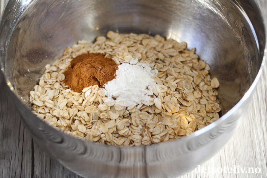 I en annen bolle blandes store havregryn med bakepulver og kanel.