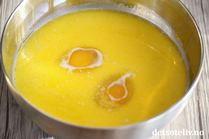 Bland eggene lett sammen med melk, lønnesirup, eplemos (eller most banan), smeltet smør og vaniljeekstrakt.