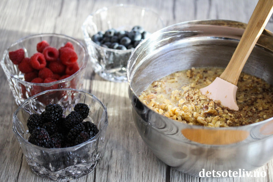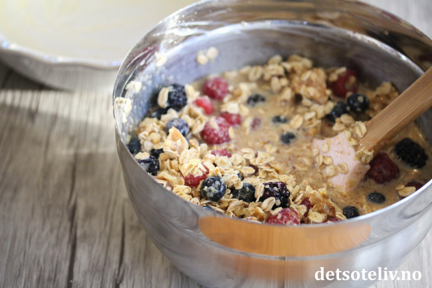 I en annen bolle blandes store havregryn med bakepulver og kanel. Ha det tørre i bollen med det våte og bland godt sammen. Vend så inn grovt hakkede valnøtter og bærene.
