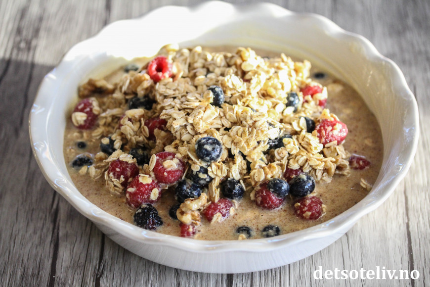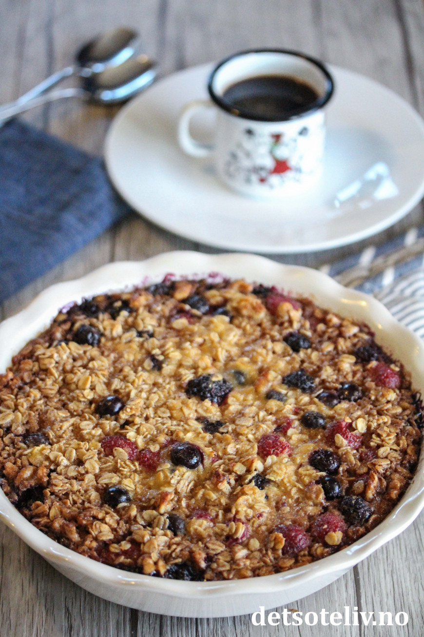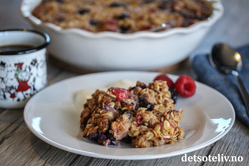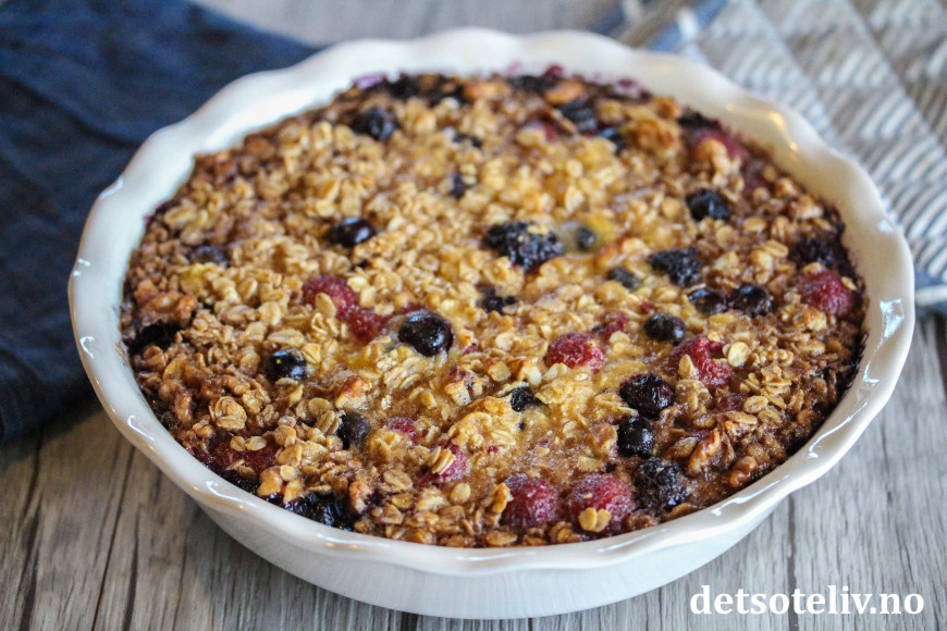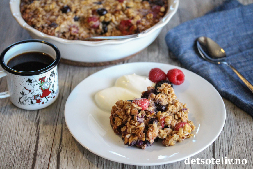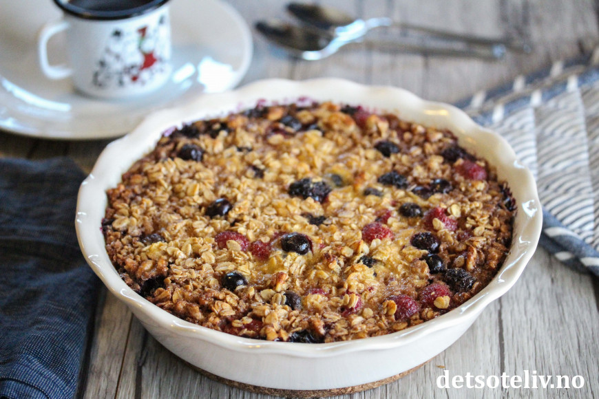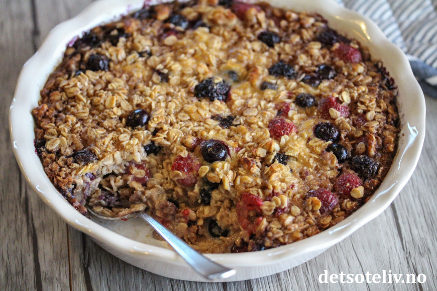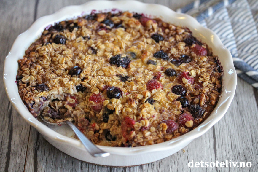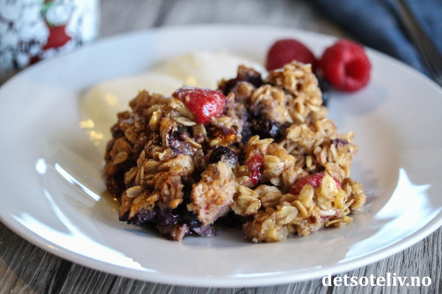 Nå skal det sies at denne oppskriften inneholder både melk, egg, lønnesirup og smør, som gjør den bakte havregrøten noe mer "kakeaktig" enn den klassiske havregrøten. Likevel - med så mye sunn havre, er dette noe å kose seg med som har masse gode næringsstoffer. Bær og valnøtter bidrar med nydelig smak.