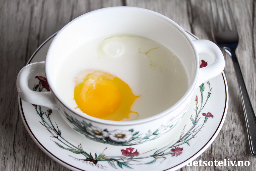 Finn frem en skål som tåler varme. Knekk i et egg. Tilsett melken (du kan bruke vanlig kumelk eller plantebasert melk). Rør dette sammen. Tilsett havregryn og NorSweet. Bland godt.