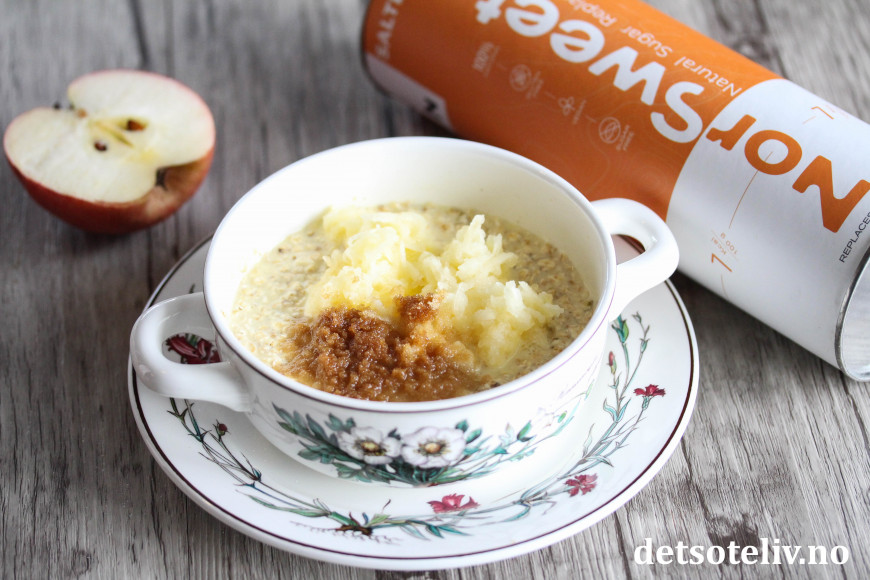Følg grunnoppskriften, og bruk NorSweet Salted Caramel. Bland i tillegg et halvt, finrevet eple i havregrøten før steking.