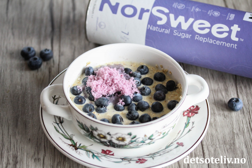 Følg grunnoppskriften, og bruk NorSweet Blueberry. Dette sukkeret får smak og blåfarge av ekte, frysetørkede blåbær! Bland også gjerne en liten neve friske eller frosne blåbær i havregrøten før steking.