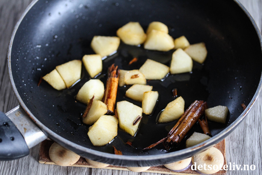 Tilsett et par skjeer vann og varm opp under omrøring til eplebitene er møre.