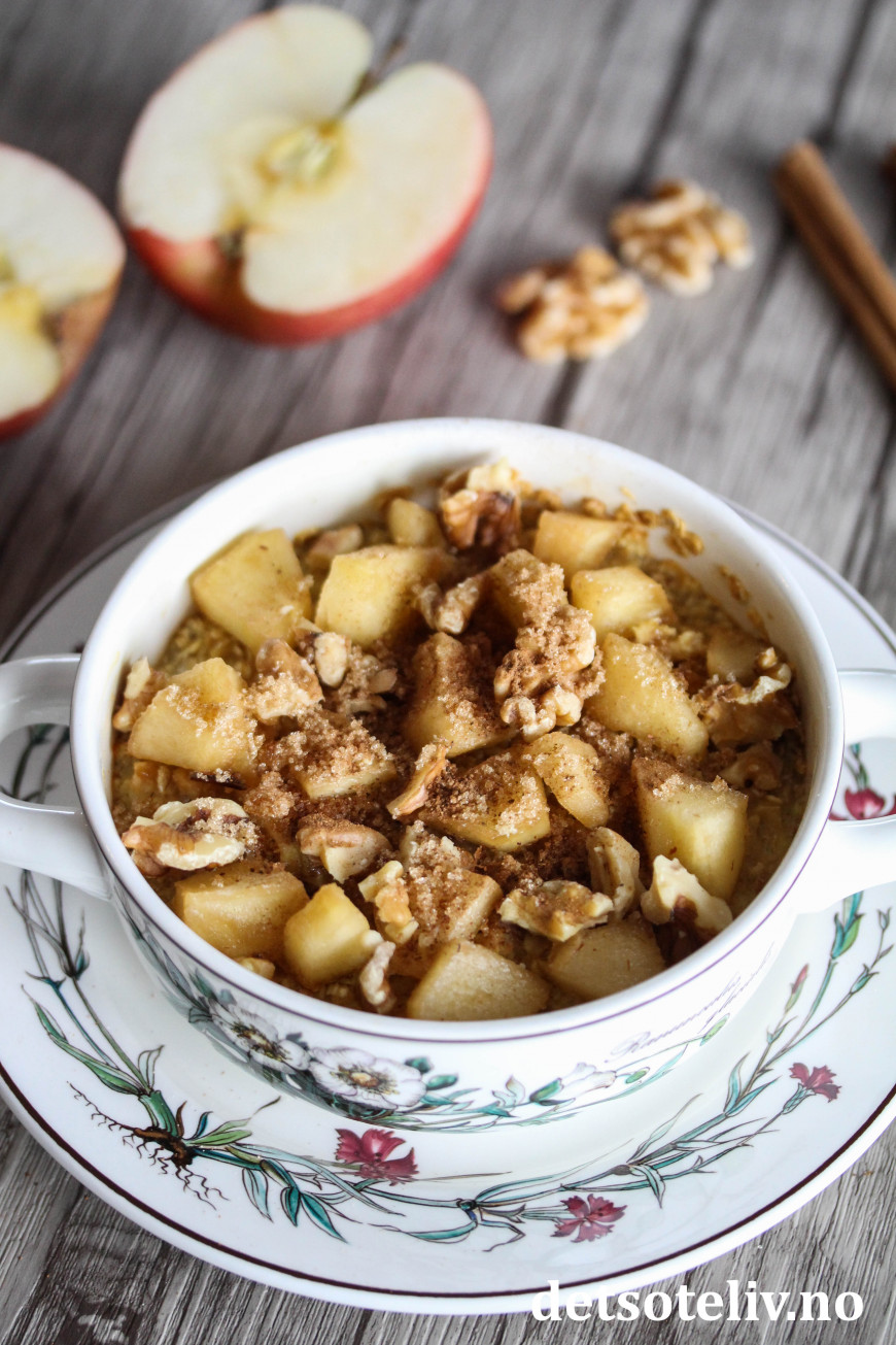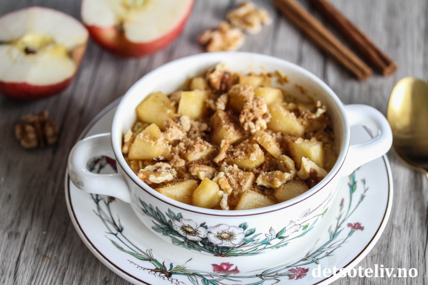 Følg grunnoppskriften, og bruk NorSweet Salted Caramel. Bland i tillegg et halvt, finrevet eple i havregrøten før steking. Stek som angitt over. Den bakte havregrøten kan toppes med friske eplebiter, eller du kan karamellisere eplebitene først. Ha i så fall eplebiter i en liten stekepanne sammen med NorSweet Salted Caramel og kanel. Tilsett et par skjeer vann og varm opp under omrøring til eplebitene er møre. Ha de karamelliserte eplebitene på den bakte havregrøten. Topp med valnøtter og et ekstra dryss med kanel og NorSweet Caramel. Serveres varm og nylaget!