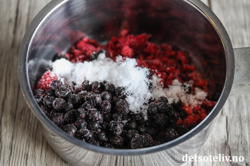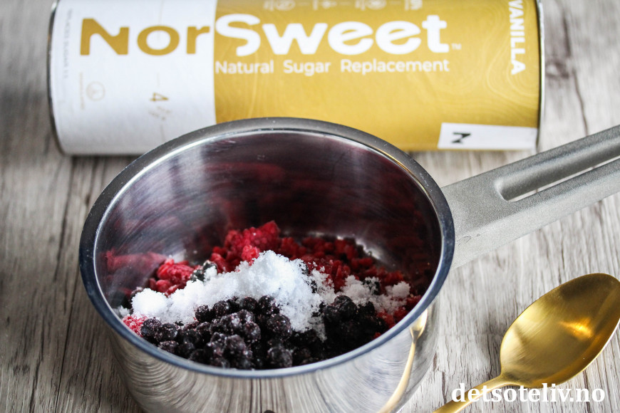 Mens havregrøten steker i ovnen, kan du gjøre klar de varme bærene. Ha en neve frosne bær (jeg bruker en miks av blåbær og bringebær) i en liten kjele sammen med en spiseskje NorSweet Vanilla.