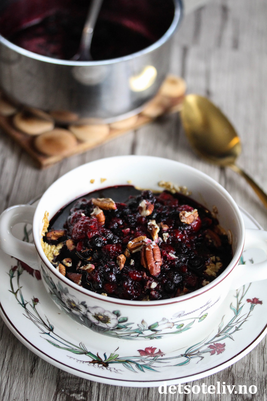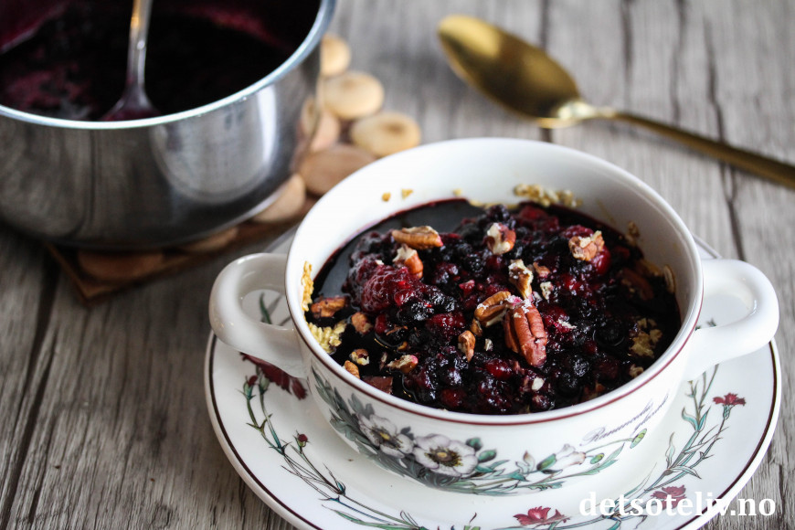 Mens havregrøten steker i ovnen, kan du gjøre klar de varme bærene. Ha en neve frosne bær (jeg bruker en miks av blåbær og bringebær) i en liten kjele sammen med en spiseskje NorSweet Vanilla. Gi bærene et raskt oppkok, og ta kjelen av platen. Fordel de varme bærene over den bakte havregrøten straks den tas ut av ovnen. Pynt med et dryss pekannøtter og server varm og nylaget! Såå godt!