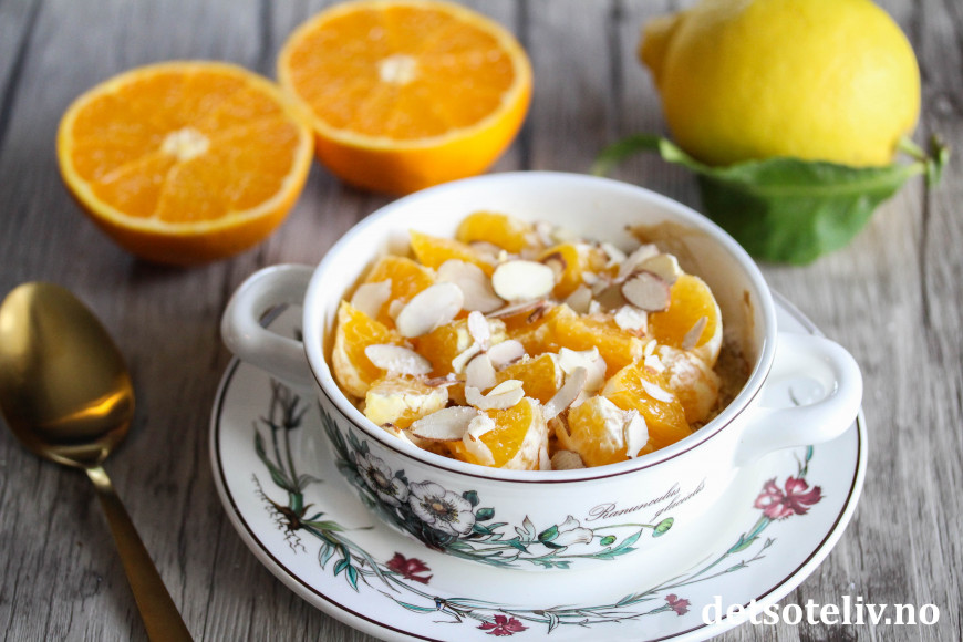 Topp den varme, nystekte havregrøten med appelsinbiter, mandelflak og et dryss NorSweet Lemon.