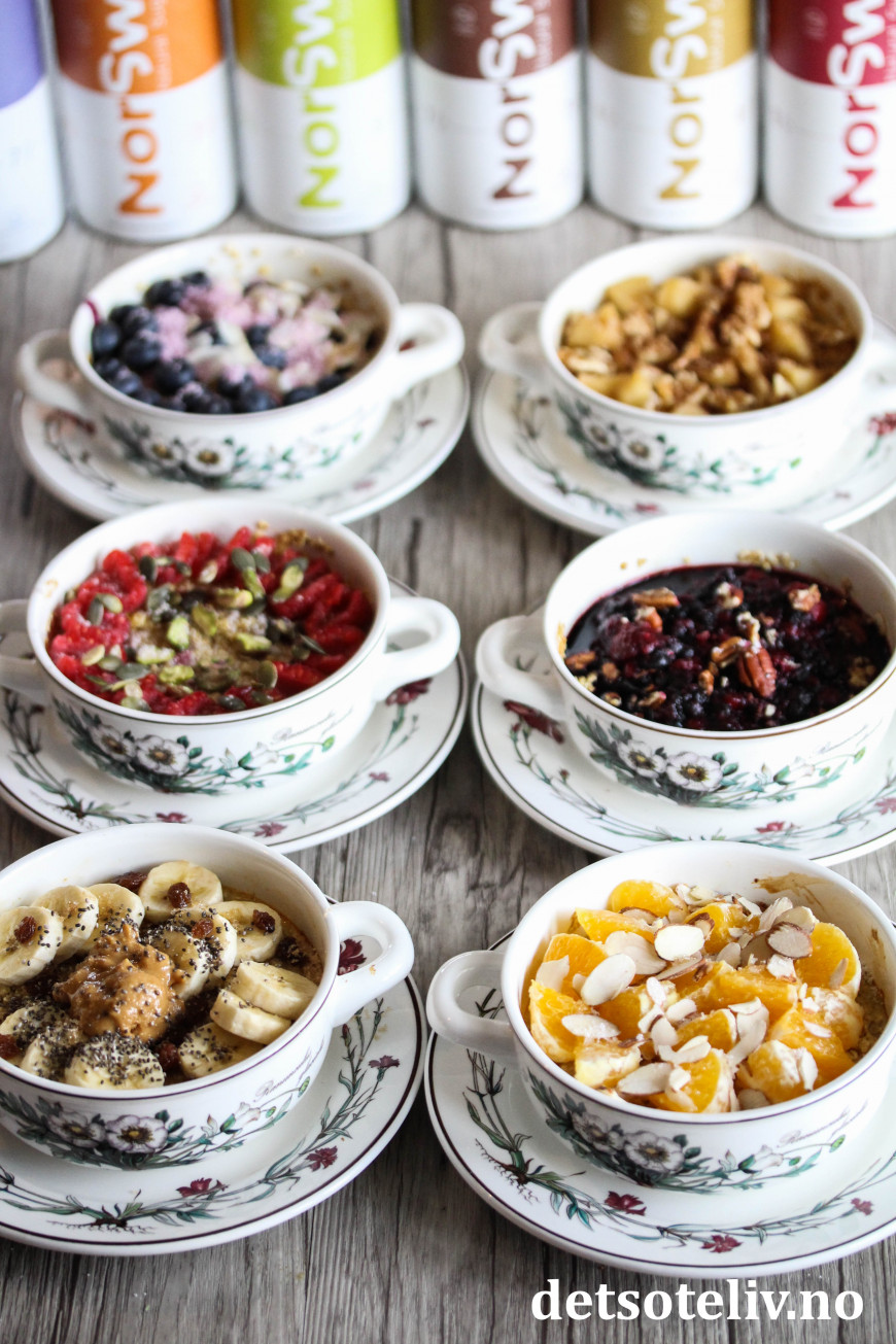 Her kommer en grunnoppskrift på bakt havregrøt i porsjonsstørrelse, som jeg brukt som utgangspunkt for å lage 6 sukkerfrie varianter. Jeg har eksperimentert med å bruke NorSweet i ulike smaker i kombinasjon med forskjellige toppinger.