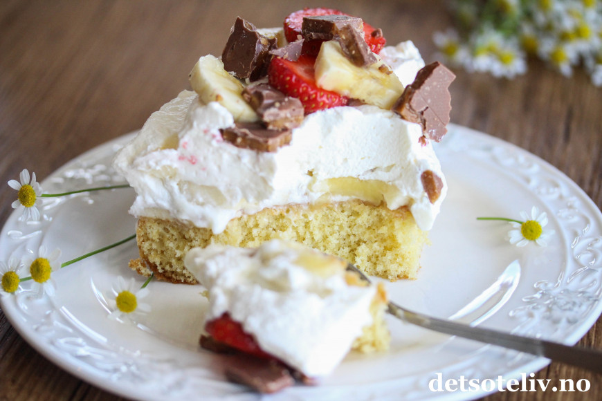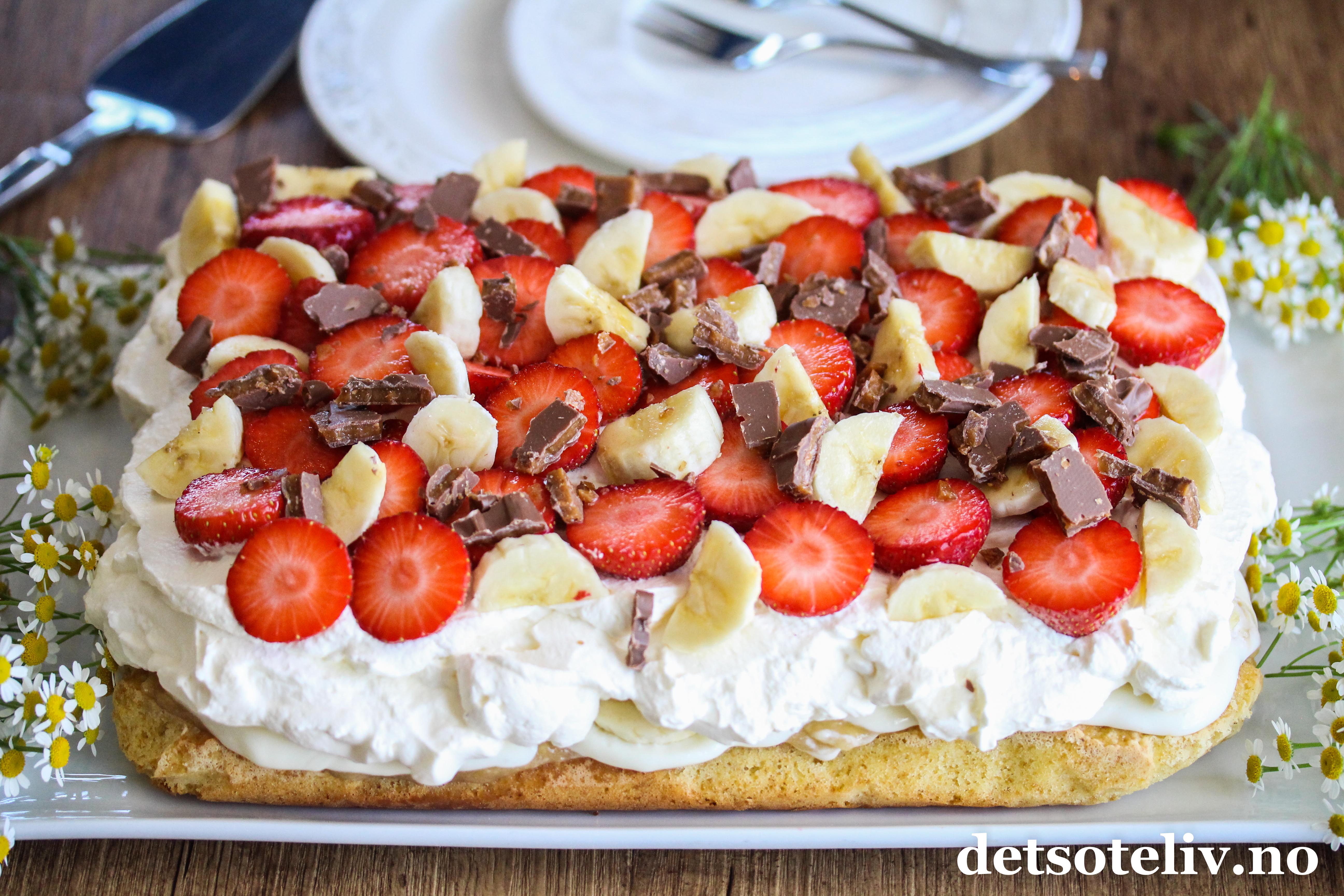 Pynt toppen av kaken med masse jordbærskiver, noen bananskiver og strø over grovt hakket Daim til slutt.