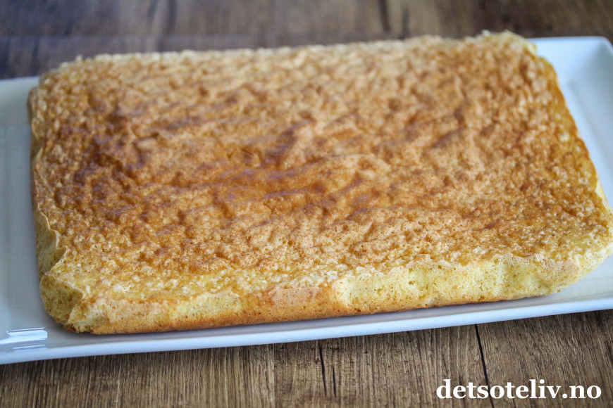 Fordel deigen utover i en liten, bakepapirkledd langpanne (ca. 20 x 30 cm). Stek kaken midt i ovnen ved 175°C i ca. 20-25 minutter (sjekk med kakenål at kaken er helt gjennomstekt i midten før du tar den ut av ovnen).