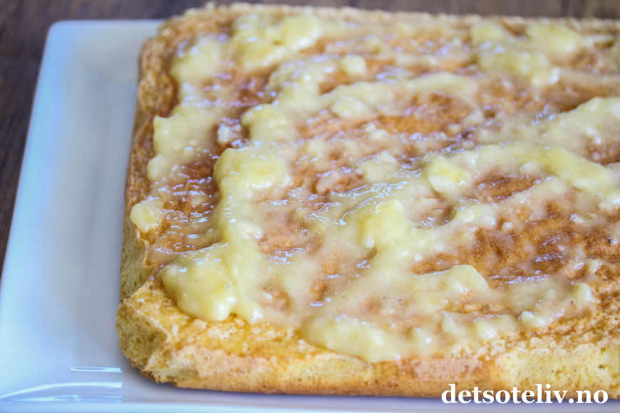 Her kommer en myk kakevariant av denne desserten som jeg har gitt det norske navnet "Bananasplittkake i langpanne".