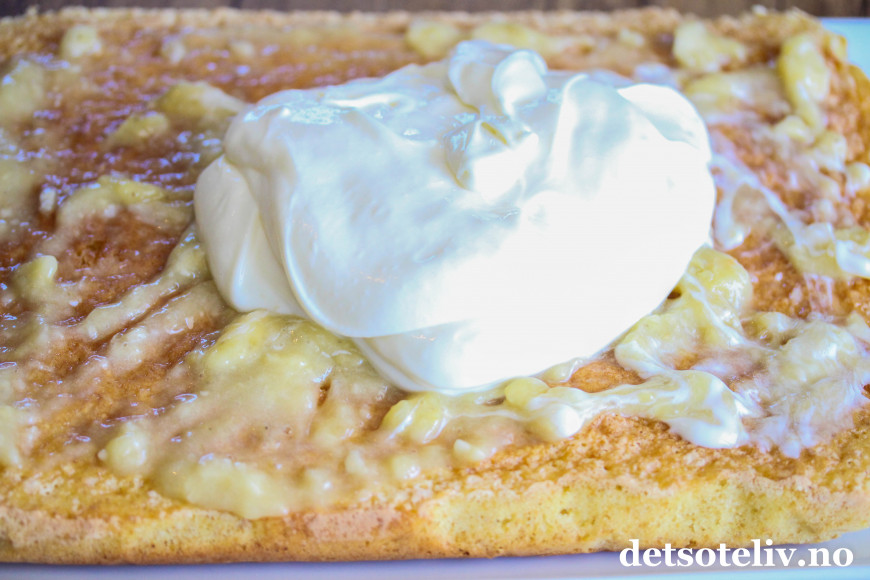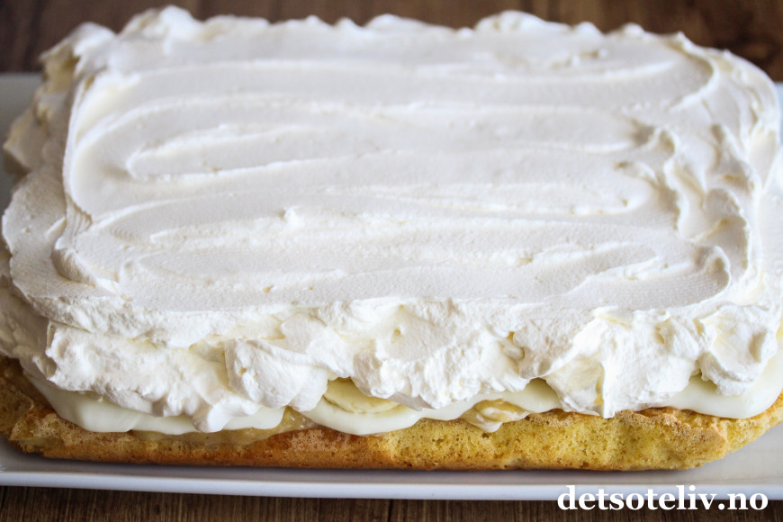 Pisk kremfløten med vaniljesukker til en luftig krem. Bre fløtekremen over bananskivene.