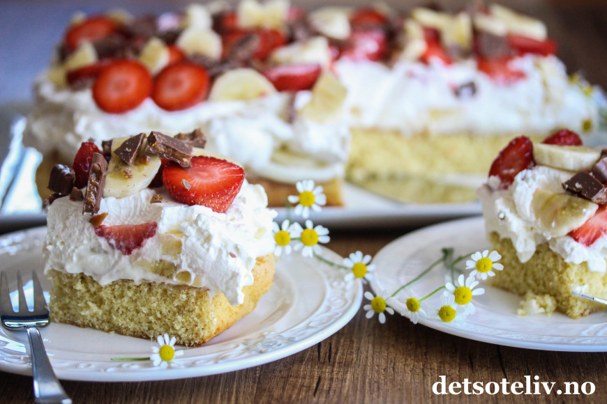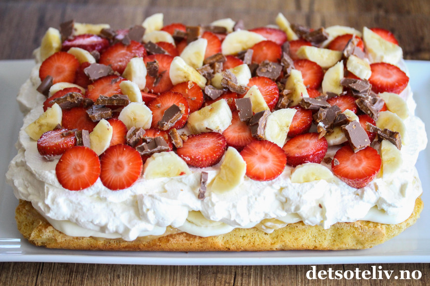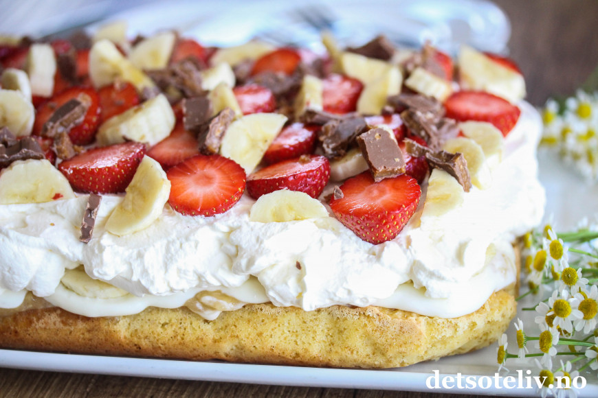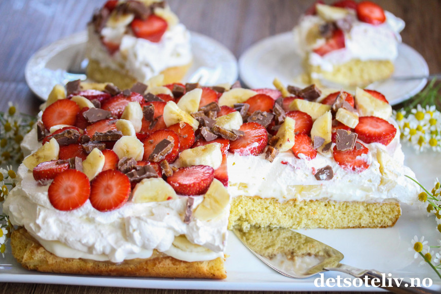 ♥ Kaken bør spises samme dag den dekkes med krem, banan og jordbær, og helst bør kaken pyntes nokså rett før servering slik at bananskivene ser lyse, fine og delikate ut.