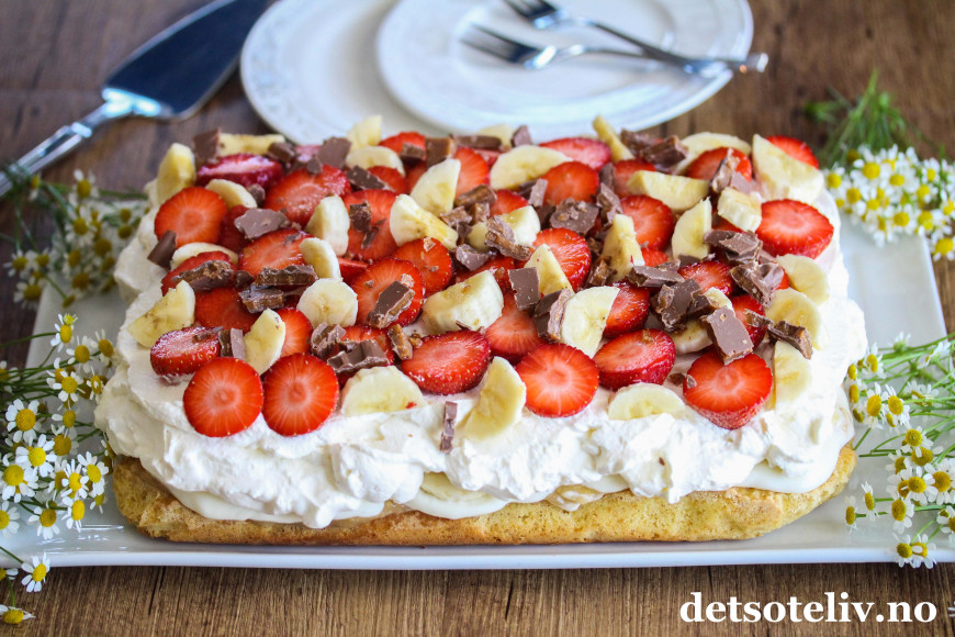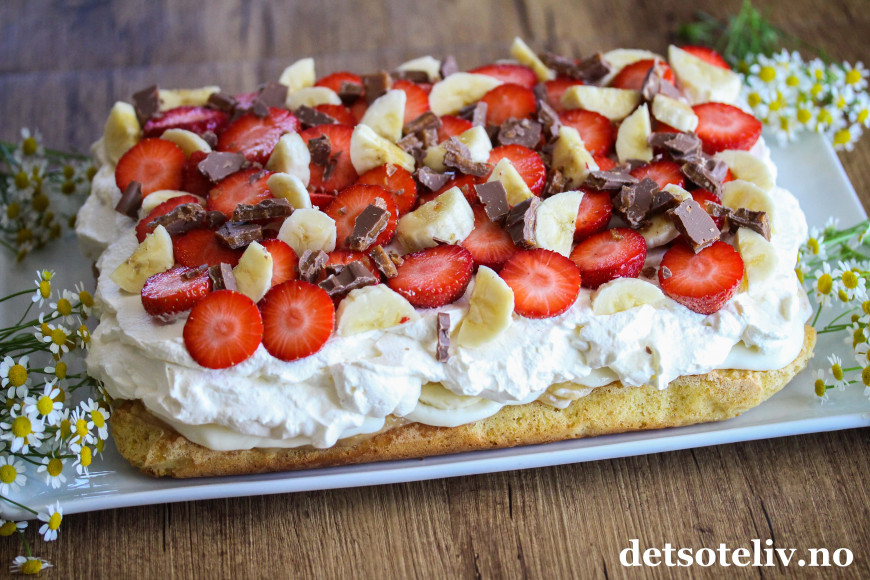 Kaken inneholder ikke iskrem, men har mange av de samme, gode smakene: krem, vanilje, banan, jordbær og sjokolade.