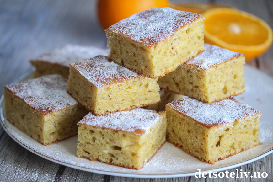 Skjær kaken opp i ruter og dryss over litt melis før servering.