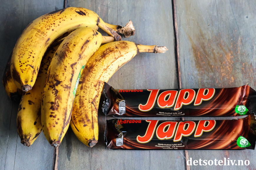 I dag kom jeg på at jeg ville blande hakket Japp i kakerøren! Det ga en kjempedeilig banankake med bløte partier sjokolade og karamell.