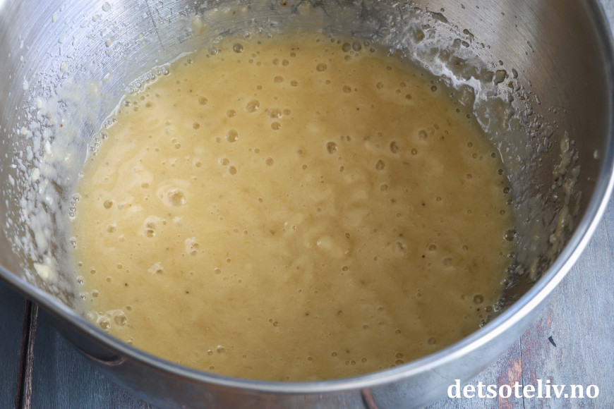 Mos bananene (jeg bruker stavmikser til dette). Tilsett egg, sukker, olje og vaniljeekstrakt og pisk det hele raskt sammen.