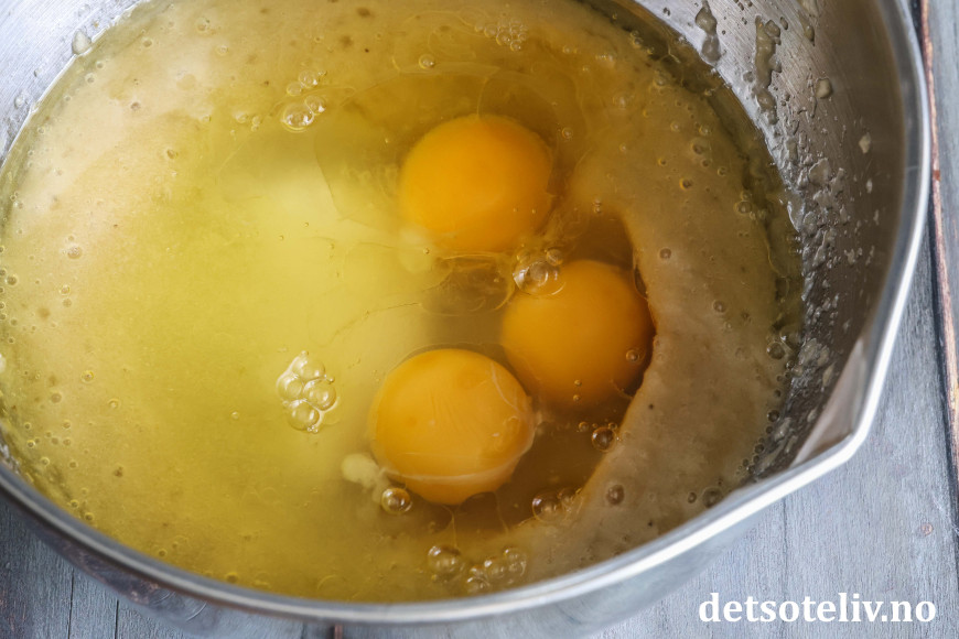 Tilsett egg, sukker, olje og vaniljeekstrakt og pisk det hele raskt sammen.