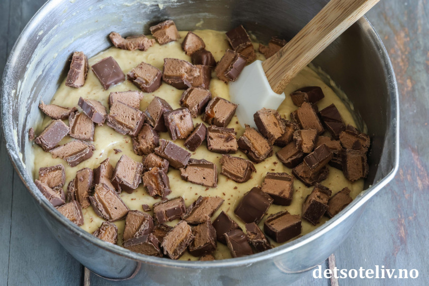 ♥ Jeg brukte her 2 stk doble Japp (à 60 gram). Det går fint å bruke en Japp til dersom du vil ha ekstra mye sjokoladebiter i kaken.