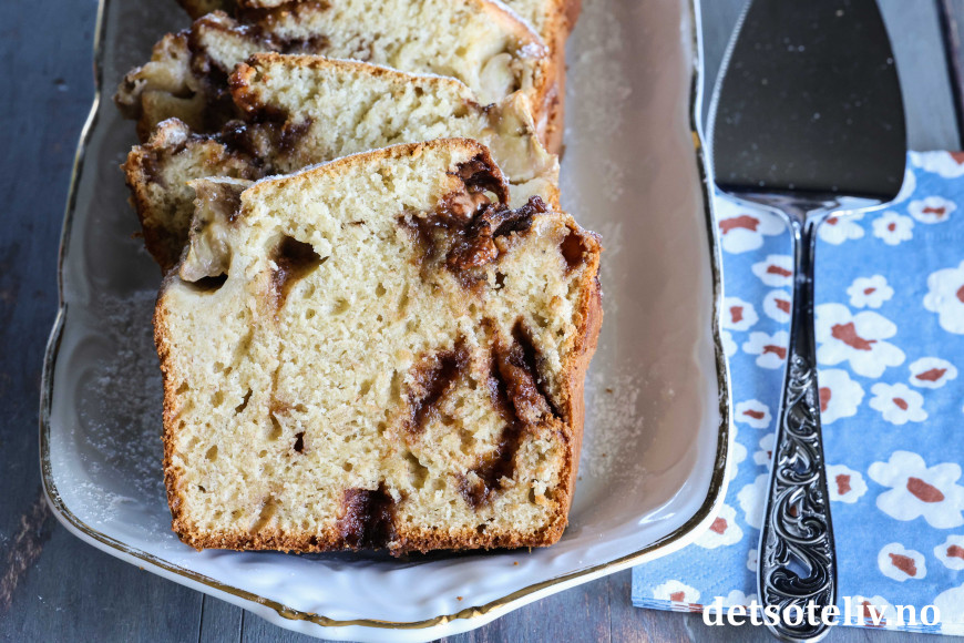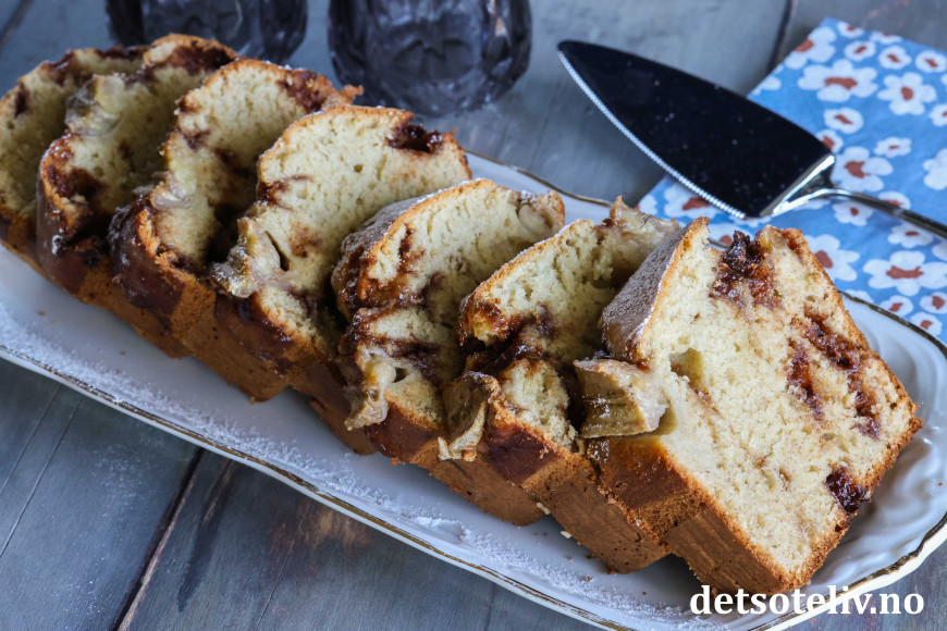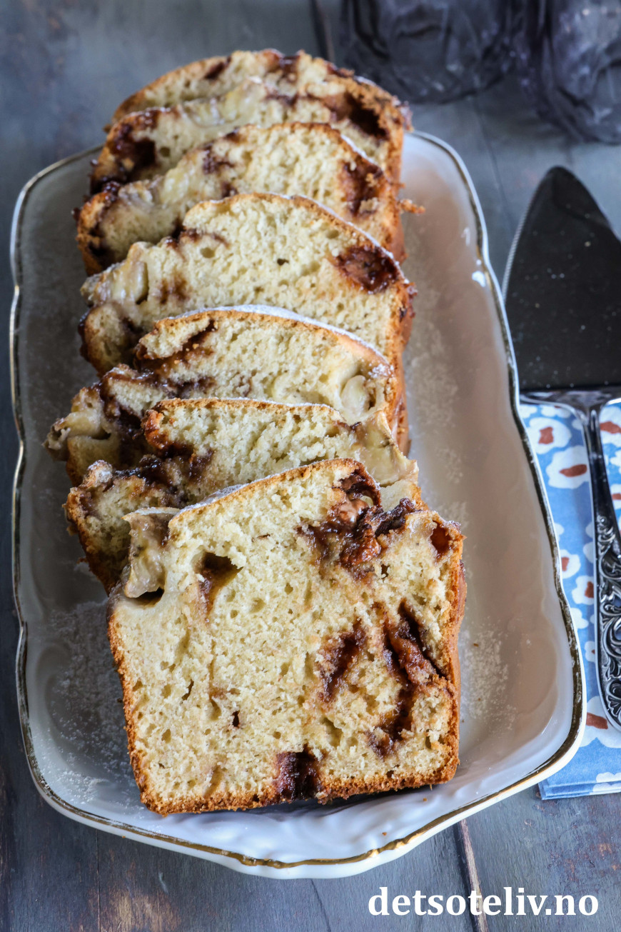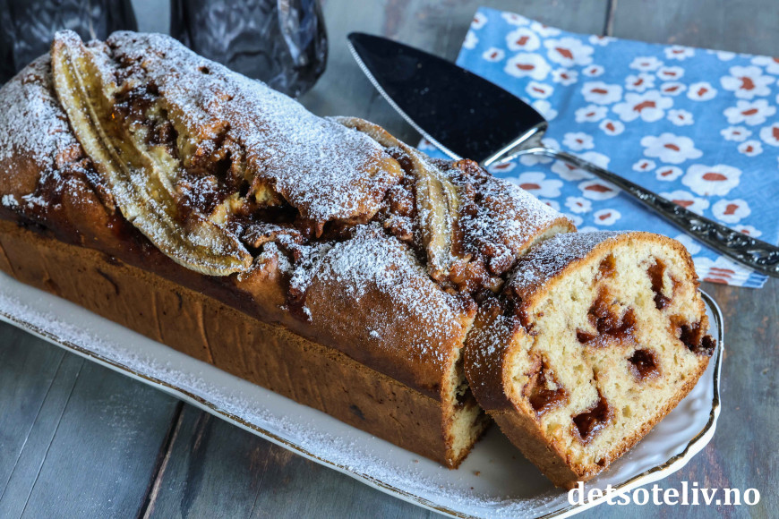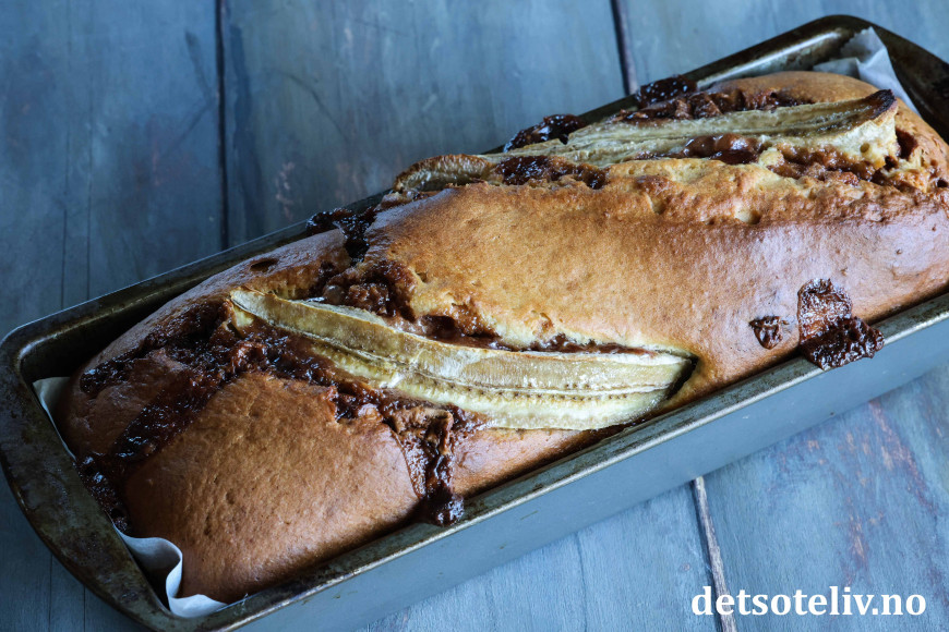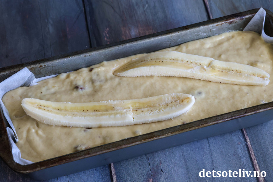 Stek bananbrødet midt i ovnen ved 180 °C i ca. 50 minutter (sjekk med en kakenål at kaken er gjennomstekt i midten før du tar den ut av ovnen).