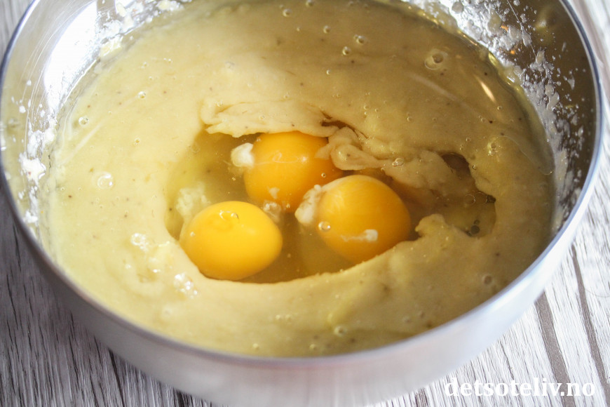 Pisk egg, sukker, olje og vaniljeekstrakt sammen. Mos bananene og bland bananmosen inn i røren.