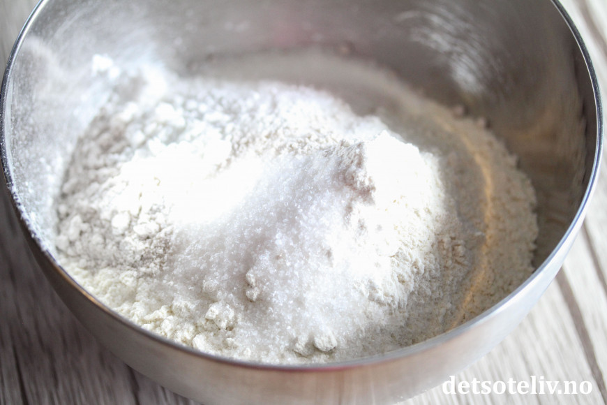 Rør inn bakepulver, salt og vend så inn hvetemelet med en slikkepott (rør så lite som mulig etter at hvetemelet er tilsatt).