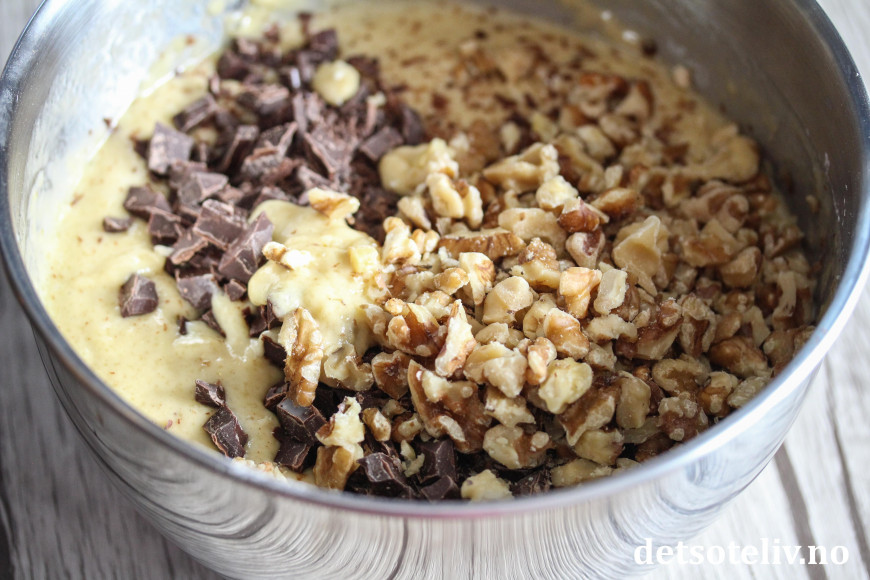 Det er viktig å bruke svært modne bananer for at banansmaken skal komme godt frem i kaken. I tillegg har jeg blandet sjokoladebiter og hakkede valnøtter i deigen, som jeg synes er nydelig.