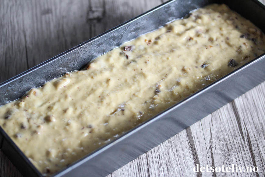 Fordel deigen i en smurt, avlang brødform (1,5 liter) som er dekket med bakepapir i bunnen.