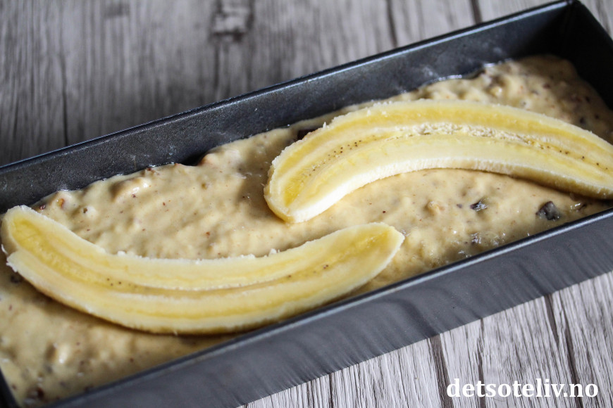Fordel deigen i en smurt, avlang brødform (1,5 liter) som er dekket med bakepapir i bunnen. Del den siste bananen på langs og legg hver halvdel oppå kaken med snittsiden vendende opp.