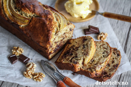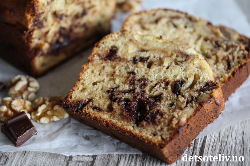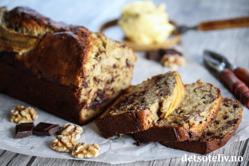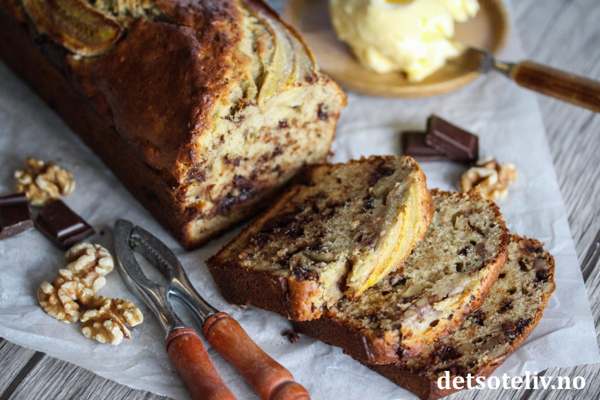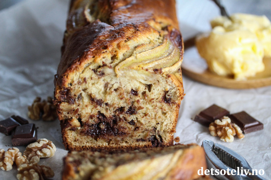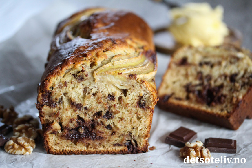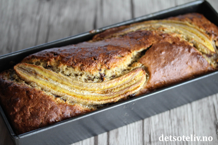 Se også Banankake med sjokolade og valnøtter og mange, mange andre varianter av banankake her på Det søte liv!