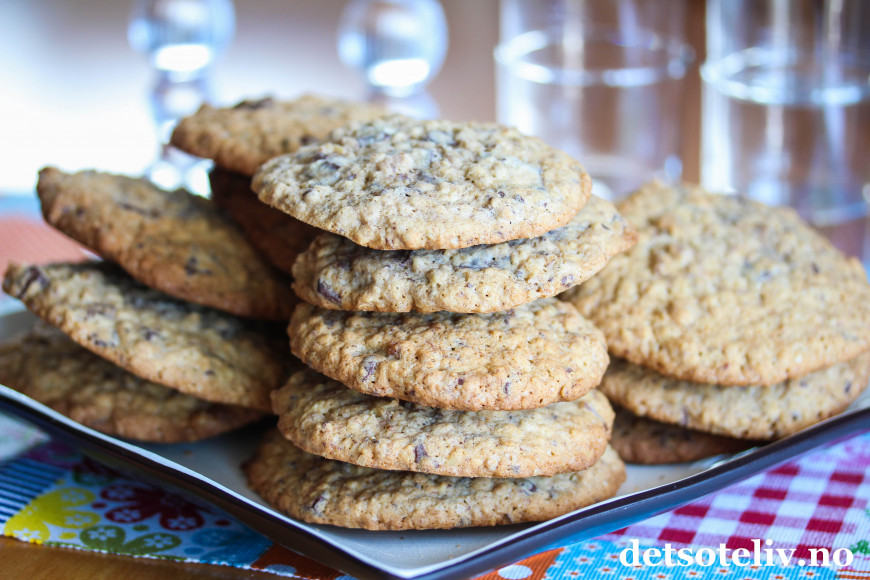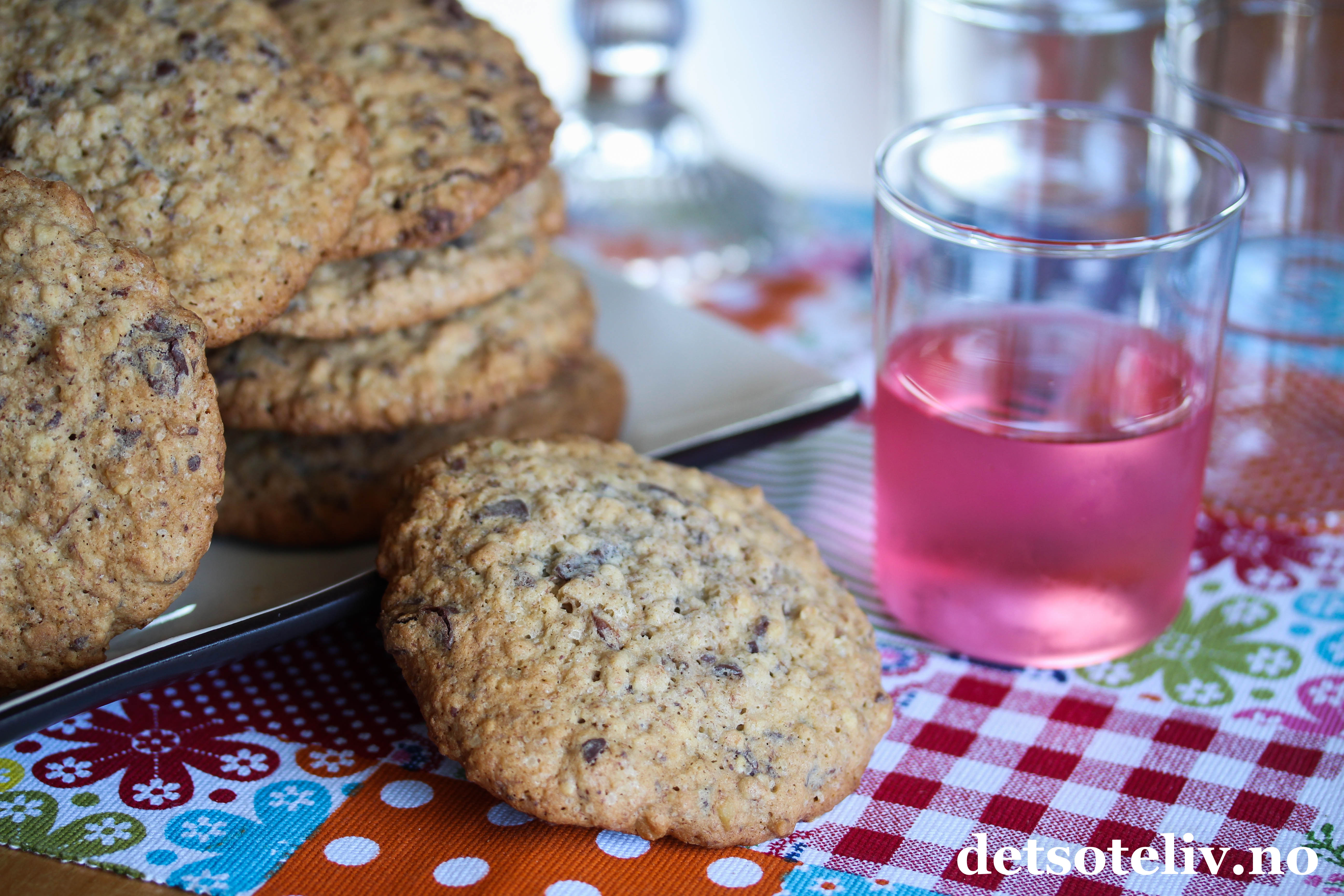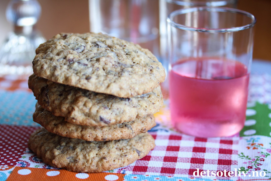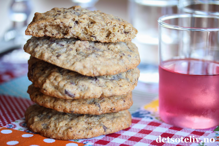 ♥ Oppskriften er basert på Banana Walnut Chocolate Chunk Cookies som du også finner her på Det søte liv - eneste forskjellen er at jeg denne gangen hakket sjokoladen og valnøttene i små biter.