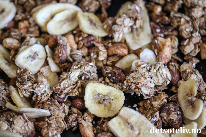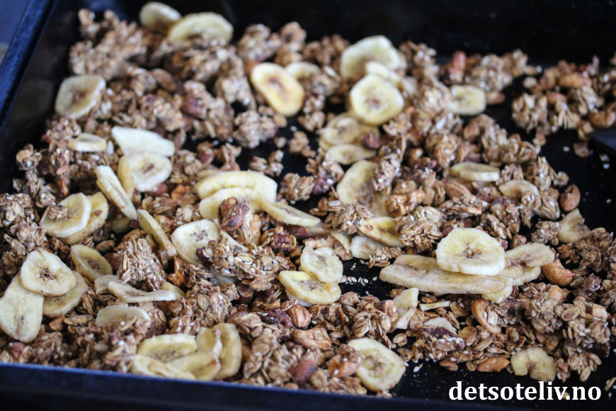 La den stekte granolaen avkjøles i langpannen til den er helt kald. Tilsett bananchips.