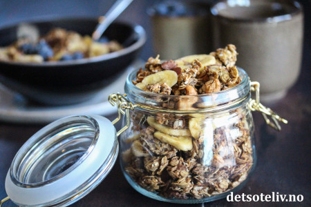 ♥ Bananchips fås kjøpt i helsekostforretninger og velassorterte matvarebutikker. De gir sødme og crunch til granolaen.