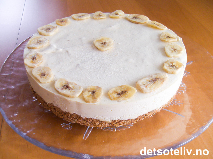 Hell iskremblandingen over nøttebunnen i formen. Sett kaken i fryseren til isen har stivnet (minst 4 timer eller over natten). Ta kaken ut av fryseren 20 min før servering. Pynt gjerne med bananchips slik som på bildet.