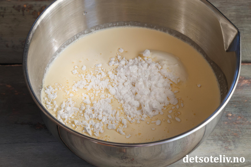 Sikt sammen det tørre. Smelt smøret og bland med melk. Ha det tørre i eggedosisen vekselsvis med smørmelken. Bland deigen godt, men ikke rør mer enn nødvendig (se tips).