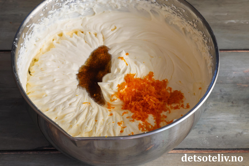 Pisk dette til du får en tykk krem. Tilsett vaniljepasta og fint revet skall fra appelsinen.